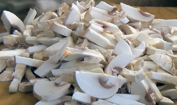- Les champignons sont déplacés, lavés et coupés en plaques minces.
