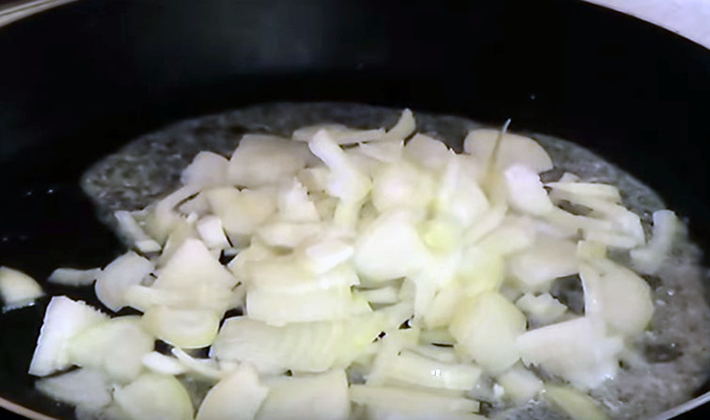 - Épluchez et hachez l'oignon en cubes, mettez-le dans une casserole avec une petite quantité d'huile végétale et faites-le frire pendant 7 à 10 minutes.