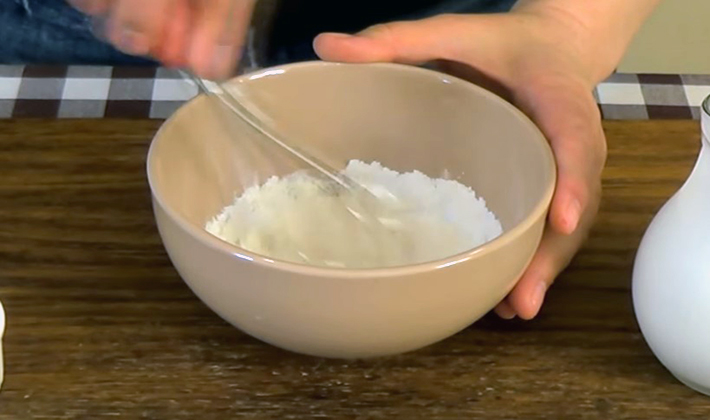 - Versez la farine uniformément (à travers un tamis) sur la surface, mélangez.
