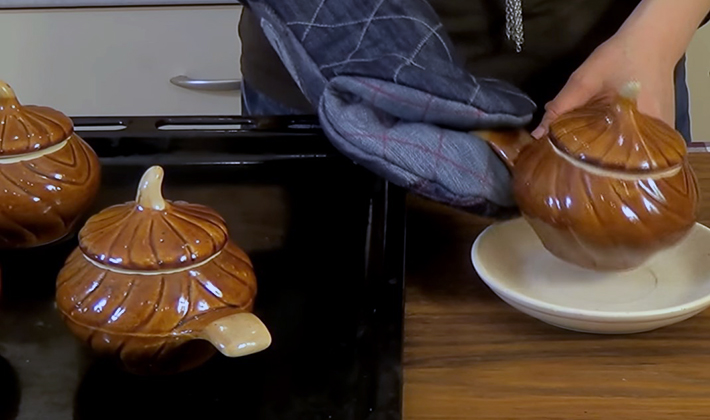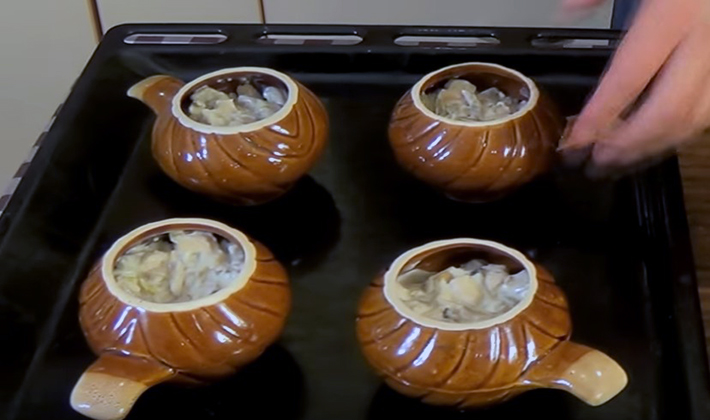 Ouvrez les couvercles des casseroles, rallumez le four pendant 10 minutes. et cuire au four jusqu'à ce que doré sur la surface du plat.