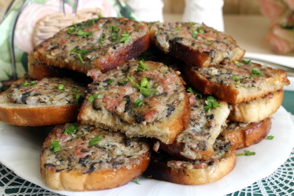 Séparez les bonnets des bonnets champignon des cuisses. Essuyez les chapeaux avec une serviette humide (mais ne lavez pas), légèrement salée. Hacher finement les jambes. Faire chauffer 1 cuillère à soupe dans une casserole une cuillerée d'huile végétale et de beurre, mettez-y les cuisses hachées et faites-les cuire 5 minutes.Ajoutez la pâte de tomates, le vin, l'ail, le sel et le poivre et laissez sur feu vif pendant encore 3 minutes. Mettez des craquelins et du persil.