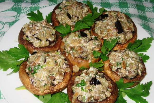 Comme vous pouvez le voir sur la photo, pour ce délicieux plat de champignons, vous devez farcir les chapeaux de champignons avec le mélange et les déposer à l'envers sur une plaque à pâtisserie graissée.