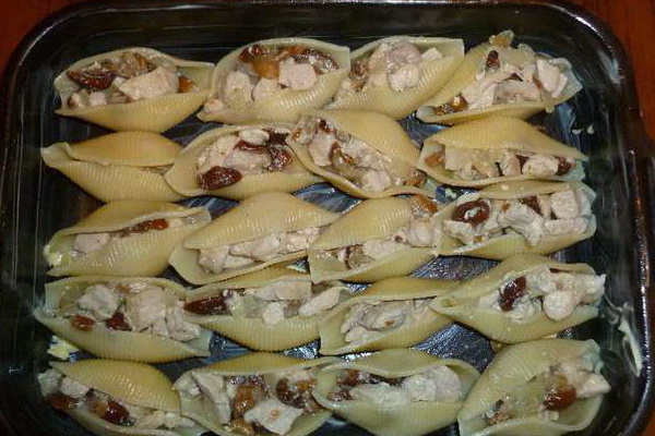 Remplissez le mélange de coquilles graissées et concassées, saupoudrez de fromage râpé. Ensuite, ce délicieux plat de champignons doit être saupoudré d’huile et bruni au four.