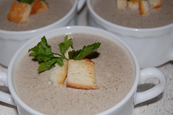 Faire bouillir les champignons dans de l'eau salée, hacher, filtrer le bouillon, casser les craquelins, verser la crème chaude, laisser refroidir, essuyer. Poudre le beurre, ajouter, sans cesser de moudre, les jaunes, les croûtons, la purée de crème, le sel, les champignons (après avoir séparé 2 cuillères à soupe pour la sauce), les blancs fouettés, la farine.