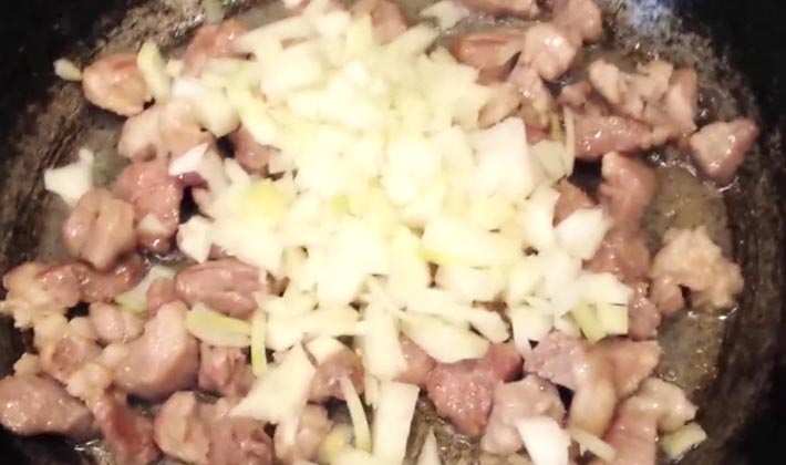 - Faites frire le porc dans une poêle bien chaude avec l'ajout d'huile végétale jusqu'à ce qu'il soit doré de tous les côtés.