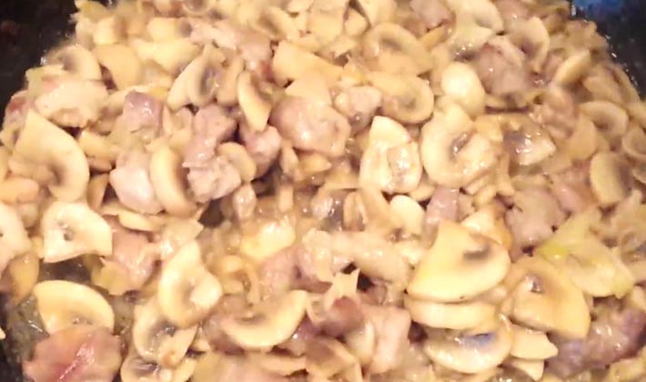 Mélangez toute la viande, les champignons et les oignons, salez à votre goût, ajoutez du poivre noir moulu, ainsi que des petits pois et des poivrons noirs.