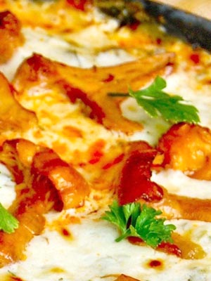 - Verser avec la sauce à la crème sure, couvrir et cuire au four pendant 30 à 40 minutes. à 180 ° C