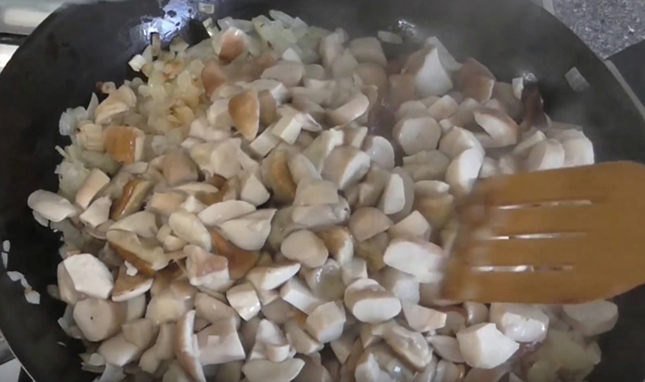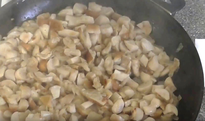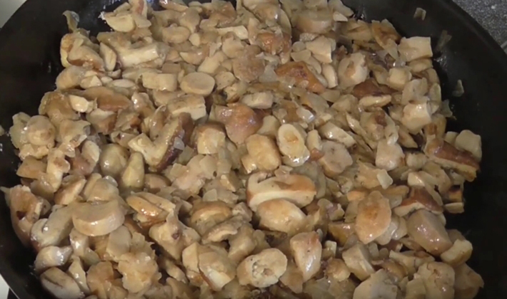 - Faire frire les champignons pelés et bouillis dans une casserole jusqu'à ce que le liquide s'évapore, puis transférer dans un bol profond. Vous pouvez également utiliser des fructifications congelées pour la cuisson, mais elles doivent être décongelées naturellement, déplacées du congélateur au réfrigérateur pendant la nuit.