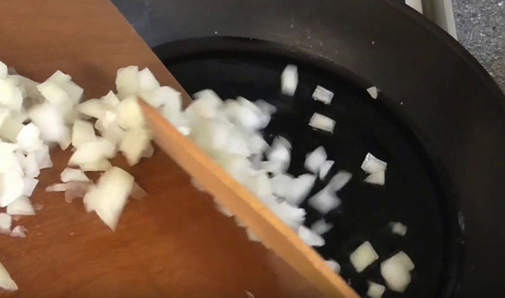 - Faire frire à feu moyen pendant plusieurs minutes et ajouter les oignons, mélanger.