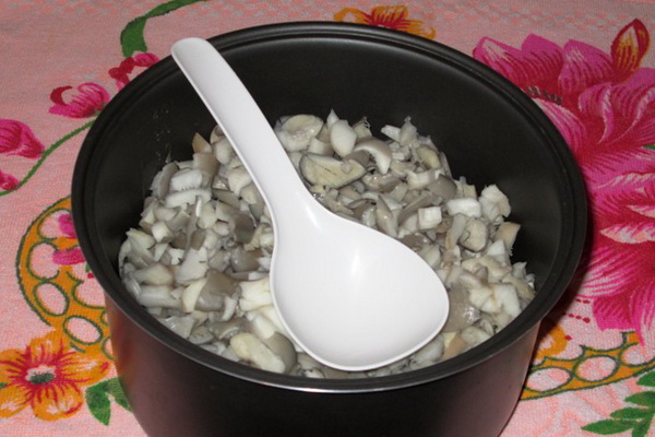 Avant de cuire un plat de cuisses de champignons dans une mijoteuse, les champignons bouillis et réfrigérés doivent être coupés en tranches et mis de côté pour le moment.