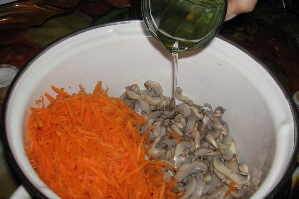 Mettez les champignons avec les carottes dans des pots stérilisés, faites bouillir la marinade aux champignons et versez dans des pots.