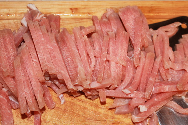 Lavez le porc, séchez-le avec une serviette et coupez-le en petits morceaux de 1 cm d'épaisseur.