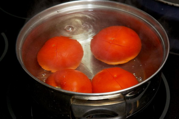 Baisser les tomates pendant 10 secondes. dans l'eau bouillante, puis immédiatement au froid, retirez la peau et coupez-la en petits cubes.