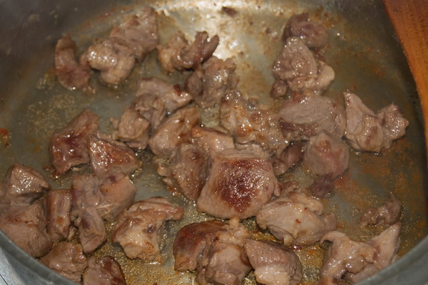 Couper le porc en petits cubes et les faire revenir dans une poêle sèche jusqu'à ce qu'ils soient dorés.