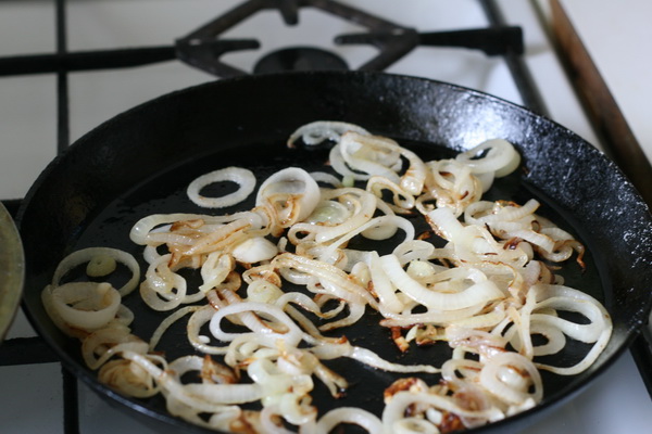 Épluchez l'oignon, coupez-le en rondelles fines et faites-le frire dans l'huile jusqu'à tendreté.