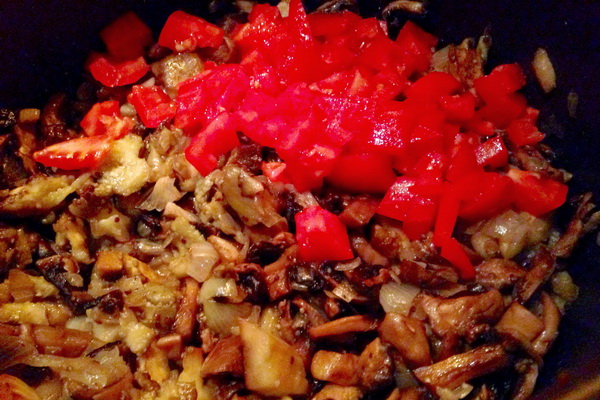 Mettez les tomates et les champignons hachés dans l'oignon, faites-les frire pendant 10 minutes.