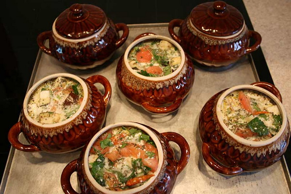 Les pleurotes en pots avec pommes de terre et viande seront cuits au four à une température de 180 ° C.