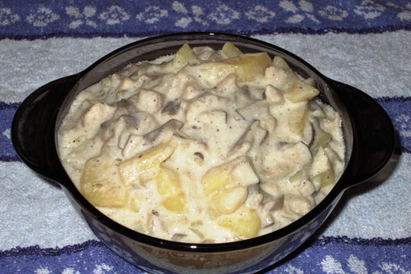 - Pleurotes avec de la viande à la crème sure dans une casserole