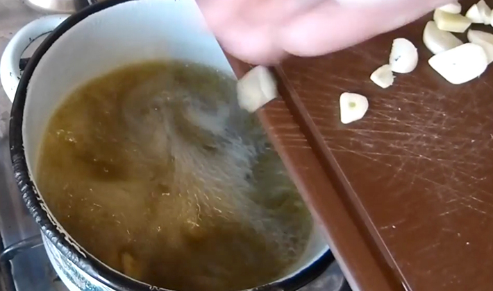 Faites bouillir pendant 15 minutes, ajoutez le vinaigre et l'ail haché en petits cubes.