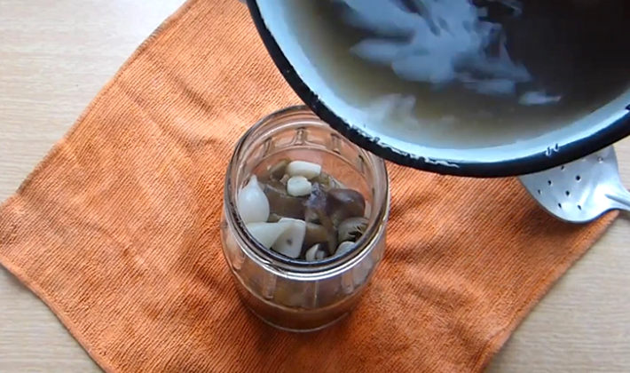 - Filtrer et remplir les boîtes de conserve de champignons avec de la saumure, fermer le couvercle hermétiquement fermé et, après refroidissement, les sortir dans une pièce sombre et fraîche.