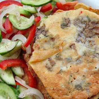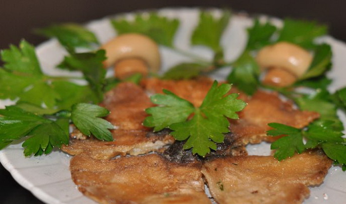 Un tel plat frit avec deux types d'huile est copieux et aromatique. Il doit être servi chaud avec de la purée de pommes de terre ou du riz bouilli.