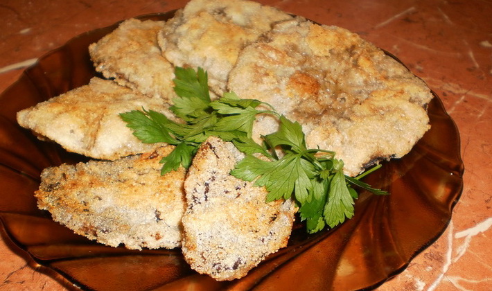 Comment faire cuire de jeunes parapluies cuits dans un mélange d'œufs et de chapelure? Notez que le plat est préparé en 5 portions et servi avec une purée de pommes de terre ou des pâtes.