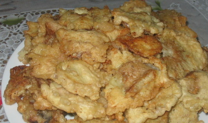 Les chapeaux coupés en deux dans le sens de la longueur, plongés dans la masse cuite et mis à frire dans une poêle préchauffée. Frire à feu doux jusqu'à coloration dorée des deux côtés.
