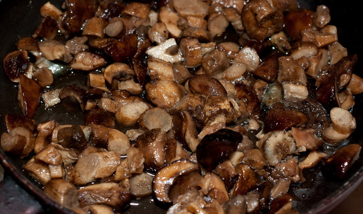 Faites fondre une partie du beurre dans une casserole et ajoutez un peu de légume. Lorsque vous faites frire des parapluies, ajoutez une certaine quantité d’huile dans la poêle.