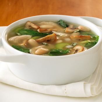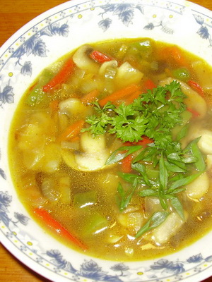 Faire bouillir les champignons, filtrer et couper en tranches. Dans un bouillon de champignons en ébullition, mettre le chou haché et laisser bouillir. Ajouter les champignons préparés, coupés en lanières et l'oignon frit, les carottes et la racine de persil, les tranches de pomme de terre, les gousses de haricots verts hachées et cuire pendant 15 à 20 minutes. Puis introduisez des tomates fraîches en tranches, bouillies dans de l'eau salée, des petites inflorescences de chou-fleur, de pois verts, de sel, de poivre, mettez une feuille de laurier et faites cuire jusqu'à cuisson complète. Cuite selon cette recette, une soupe aux haricots et aux champignons saupoudrée de persil finement haché.