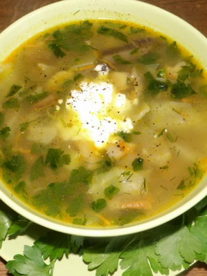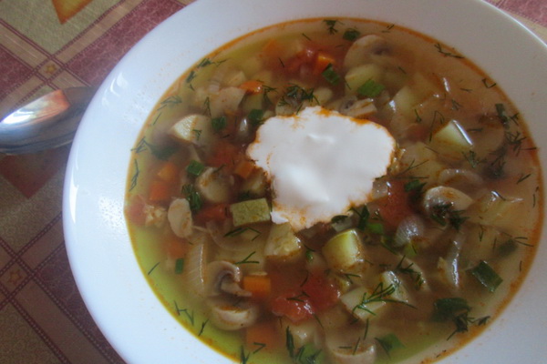 Avant de faire cuire une telle soupe aux champignons, vous devez laver les légumes et les hacher finement. Faites fondre le beurre dans une casserole peu profonde et faites-y légèrement revenir les légumes sans les laisser noircir. Verser le bouillon, porter à ébullition, saler, poivrer et cuire à feu doux pendant 45 minutes. 30 minutes avant de servir, ajoutez des champignons fraîchement pelés et hachés finement. Servir avec de la crème sure.