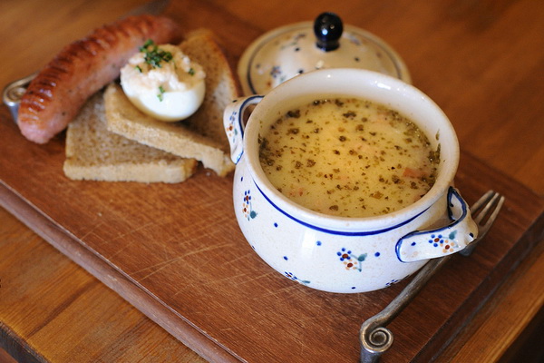 Pour la garniture, mettez les champignons et les cous cancéreux coupés en lanières dans la soupe. Assaisonner la soupe avec de la crème bouillie et des jaunes d'oeuf; ajoutez un morceau d'huile.