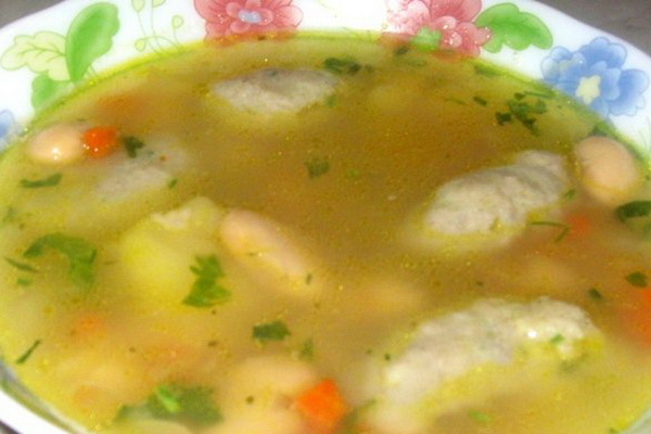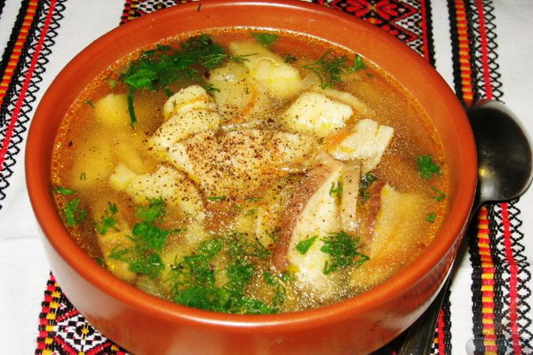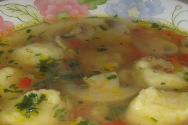 Cuire le bouillon de champignons frais ou séchés. Cuisson de boulettes de pommes de terre. Faire bouillir les pommes de terre, sécher et pétrir, incorporer les œufs crus, ajouter la farine, le sel et bien mélanger. Deux cuillères à café pour former des boulettes et les abaisser dans un bouillon bouillant. Saupoudrer la soupe finie avec des herbes finement hachées.