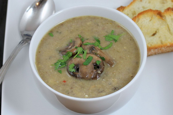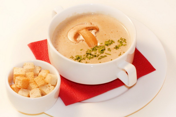 Une autre méthode de préparation de la soupe aux champignons est la même que pour les autres plats principaux en purée. Avant de passer les champignons dans un hachoir à viande, séparez quelques chapeaux, coupez-les en lanières et faites cuire dans un bouillon légèrement salé. Mettez les champignons bouillis dans des assiettes et versez-y la soupe. La soupe peut être servie avec des croûtons.