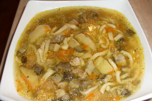 Faire bouillir les champignons, hacher, filtrer le bouillon. Pétrir la pâte, la rouler finement, laisser sécher et couper en forme de nouilles. Faites-le bouillir dans un bouillon de champignons, ajoutez l'huile, l'oignon frit dans l'huile, la crème sure. Réchauffez-vous sans faire bouillir. Servir avec de la crème sure.