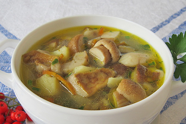 Pour préparer une soupe aux champignons à partir de champignons au miel, vous devez faire fondre le beurre dans une casserole, ajouter les oignons et les champignons hachés lavés. Laisser mijoter pendant 20-30 minutes, puis épaissir avec la farine de blé diluée dans de l'eau froide jusqu'à la consistance désirée. Laissez la soupe bouillir quelques minutes de plus, puis ajoutez la crème sure et les épices au goût. Saupoudrer généreusement de persil finement haché.