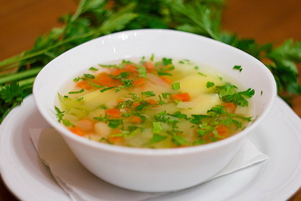 20 g de champignons, 400 g de pommes de terre, 75 g de chou blanc, 50 g de chou-fleur, 140 g de tomates, 60 g d'oignon, 60 g de carottes, 10 g de racine de persil, 90 g de haricots verts, 70 g de petits pois verts en conserve, 30 ml d'huile végétale en conserve , sel, poivre, feuille de laurier.