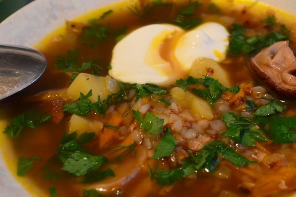 Faire bouillir le bouillon de champignons porcini. Mettez les oignons, les carottes, le persil, la feuille de laurier, laissez bouillir pendant 1 heure et demie, faites bouillir l’orge perlée dans de l’eau salée, mettez-la sur une passoire; quand il égoutte, mettre dans une casserole, verser dans le bouillon de champignons filtré, mettre les champignons finement hachés, ajouter le sel au goût, faire bouillir pendant 15 minutes à feu doux. Dans la recette préparée conformément à cette recette, ajoutez une soupe aux champignons avec de l’orge, de la crème sure, du poivre noir moulu, du persil ou de l’aneth, mélangez bien et servez.