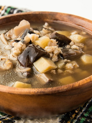 50 g de champignons porcini séchés, 100 g d'orge perlé, 2 pommes de terre, 2 oignons, 1/2 tasse de crème sure, 2 c. à soupe de beurre, sel.