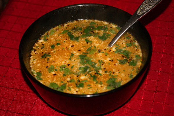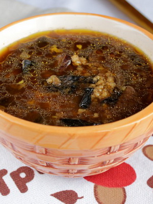 Mélanger l'eau filtrée avec les champignons, porter à ébullition, ajouter le mil, l'oignon haché, le sel, cuire pendant 5-6 minutes et insister pendant 30-40 minutes sans chauffage. Cuite selon cette recette, soupe de champignons séchée, servie avec du lait aigre.
