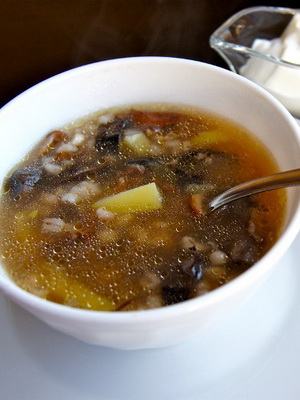Auparavant, avant de préparer une telle soupe aux champignons, les champignons séchés doivent être bouillis, hachés, égouttez le bouillon. Faites bouillir les céréales, ajoutez les pommes de terre hachées et, quand elle est cuite, versez le bouillon de champignons, ajoutez l'oignon haché, doré dans l'huile, la crème sure, l'huile, le sel. Réchauffez-vous sans faire bouillir. Servir avec de la crème sure.