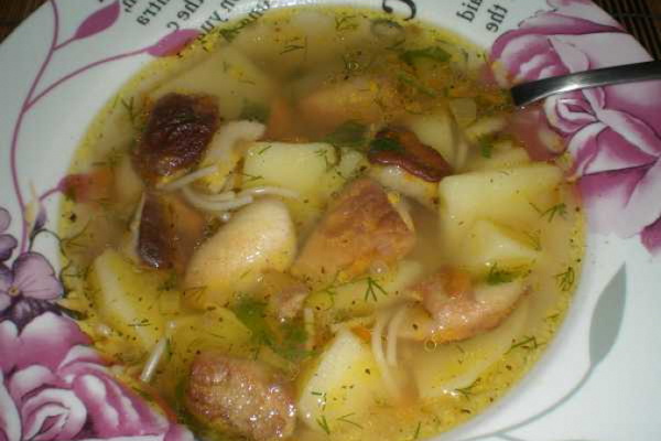 Préparez les champignons séchés comme décrit dans la recette précédente. Couper les pommes de terre en fines tranches, râper les carottes sur une râpe grossière, hacher finement l'oignon. Les champignons préparés, les pommes de terre, les carottes, les oignons et le sel sont immergés dans de l’eau bouillante, cuire pendant 5 à 6 minutes et insister pendant 20 à 30 minutes sans chauffage.