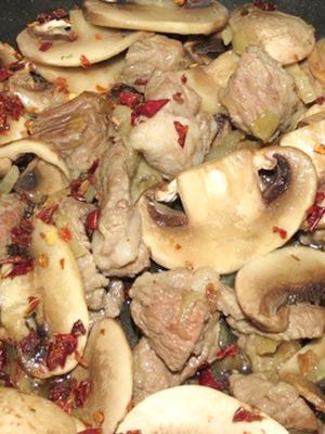 Couper le poireau et l'ajouter à la viande, faire sauter et ajouter les champignons.