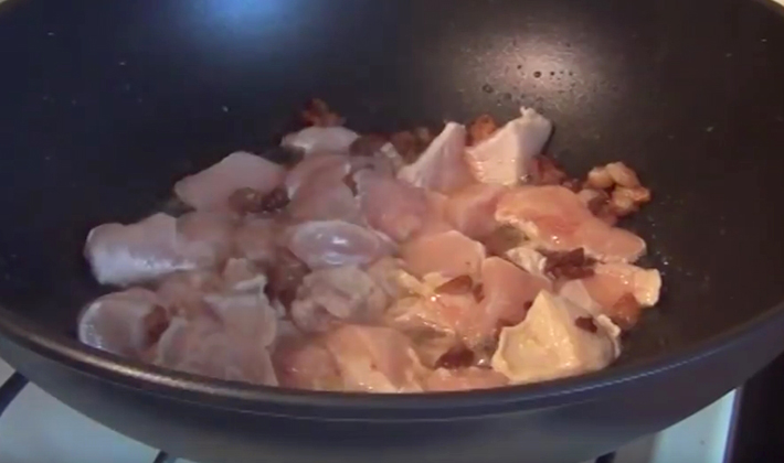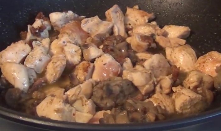 Ensuite, déposez la viande de poulet préalablement coupée en petits cubes et faites-la frire jusqu'à la fin du programme, mais pas plus de 15 minutes.