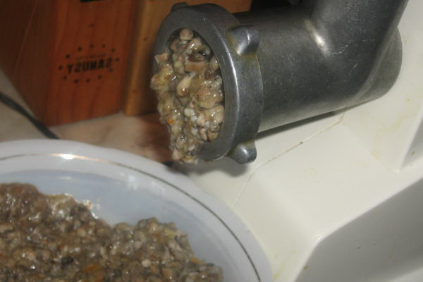 Passer dans un hachoir à viande et introduire dans les champignons.