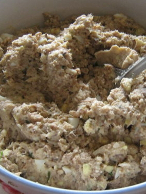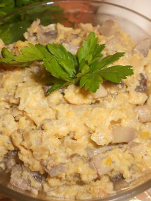 - Les œufs sont pelés, écrasés et combinés avec une garniture aux champignons.