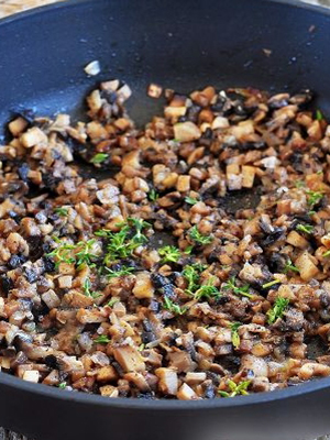 - Les oeufs, peler, hacher avec un couteau, ajouter aux champignons.