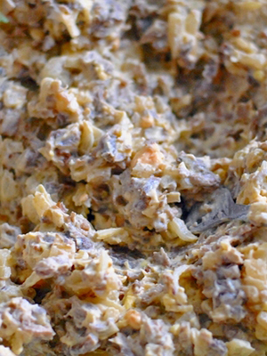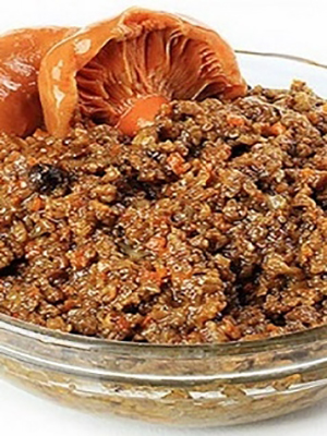 - Passer les champignons bouillis dans un hachoir à viande, presser avec les mains et les mettre dans une assiette creuse.