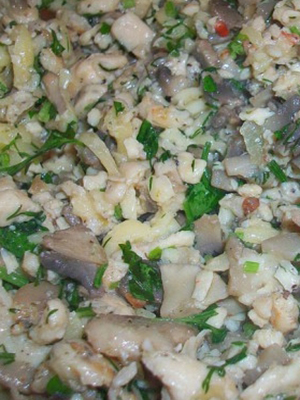 - Une fois la masse de champignons refroidie, introduisez les légumes verts hachés et mélangez.