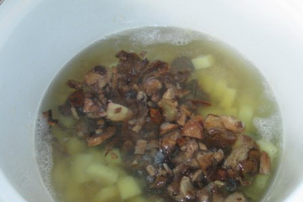 Faire bouillir les champignons, égoutter l'eau, couper en cubes et les faire frire dans l'huile jusqu'à ce que le liquide s'évapore.