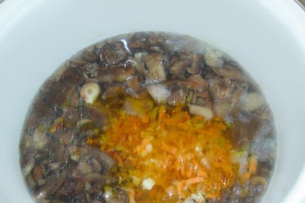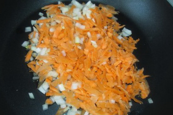 Mélanger l'oignon, coupé en demi-rondelles, les carottes râpées et les champignons hachés dans une casserole. Frire à feu doux jusqu'à ce que le liquide s'évapore des champignons.